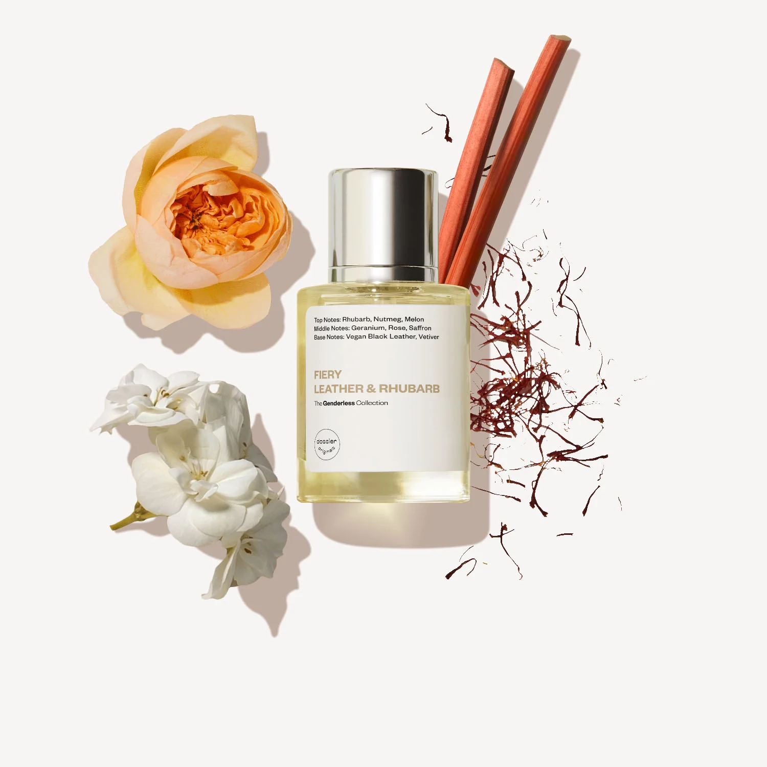 Every ingredient elevates another to deliver a balance of masculine leather and feminine florals with vegetal notes of rhubarb.